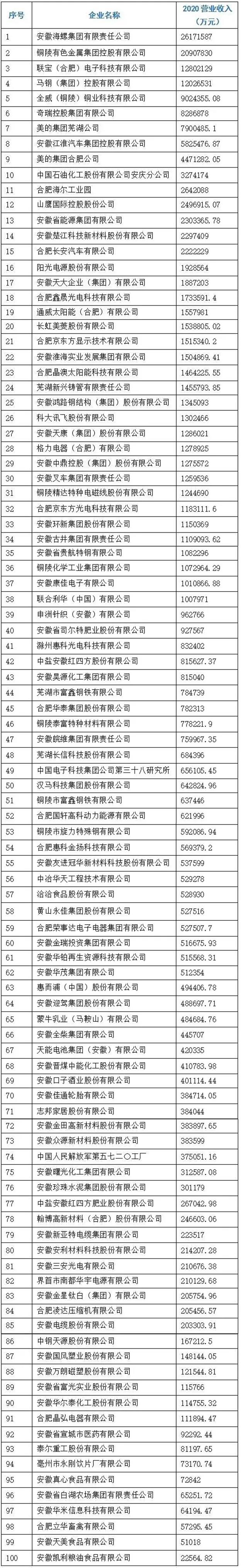 2021安徽省制造业百强红桃国际榜单